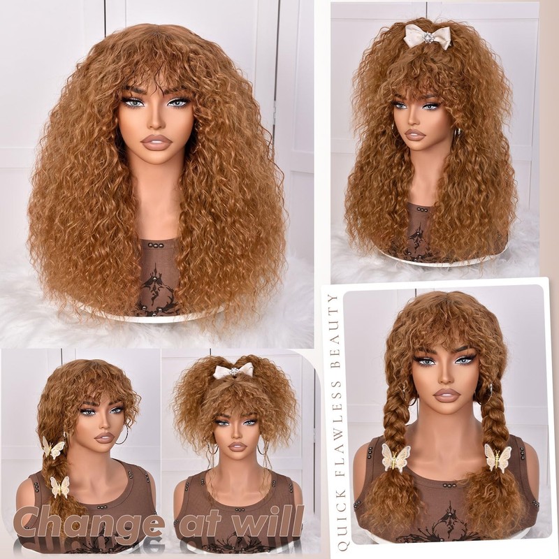 SOFUN Curly Wig With Bangs for Black Women long Curly Human Hair Glueless Wig for Daily,Realistic Look with True Scalp(Brownish Yellow)