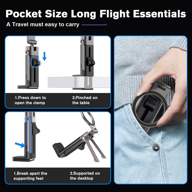- Steel-Footed Stability, Wherever You Land: Just dangling in mid-air? Not a chance. This travel phone holder packs retractable steel legs that snap out in seconds, turning shaky tray tables into rock-solid workstations. Perfect for desk phone stand mode in your home office, bedside movie nights, or propping up recipes on campsite picnic tables.