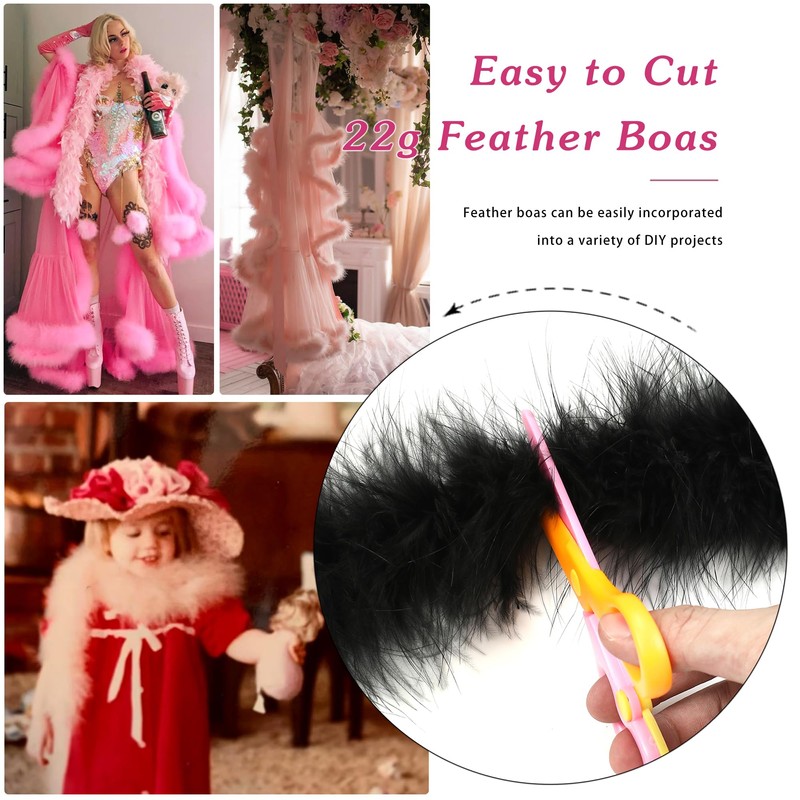 - Easy to Cut DIY Feather Boas: Marabou feather boas can be easily incorporated into a variety of DIY projects, including clothing, shoes, bags, Christmas, Halloween decorations and gift baskets. Whether you're planning a party or are obsessed with creative DIY projects, these feathers boa are the fantastic choice