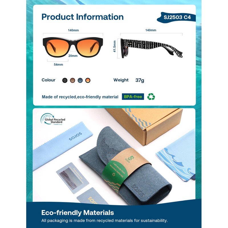 - Sustainably Packaging: Sunglass case, cleaning cloth, and pouch made from recycled plastic bottles.