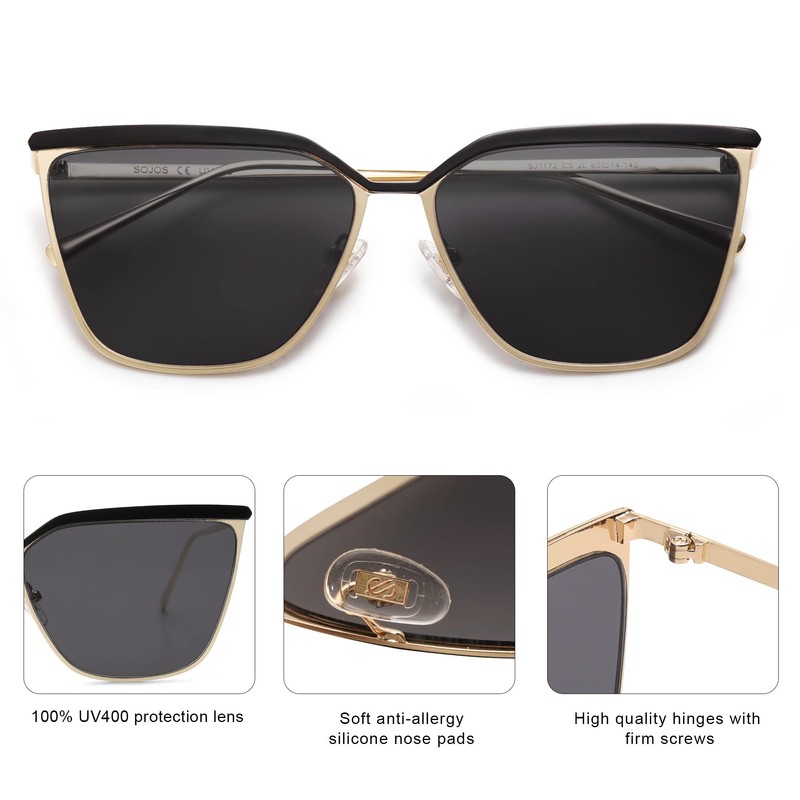 SOJOS SJ1172 Women's Vintage Cat Eye Sunglasses Men's Retro Square Large Women Rectangular Sunglasses Gold Cat Eyes with Metal Frame UV400 Protection Glasses, gold