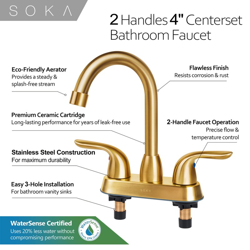SOKA 2 Handle Bathroom Faucet Gold, 4 Inch Gold Bathroom Sink Faucet Centerset with Lift Rod Drain Stopper and Supply Hoses, RV Bathroom Faucet 3 Holes, Brushed Gold Bathroom Faucet