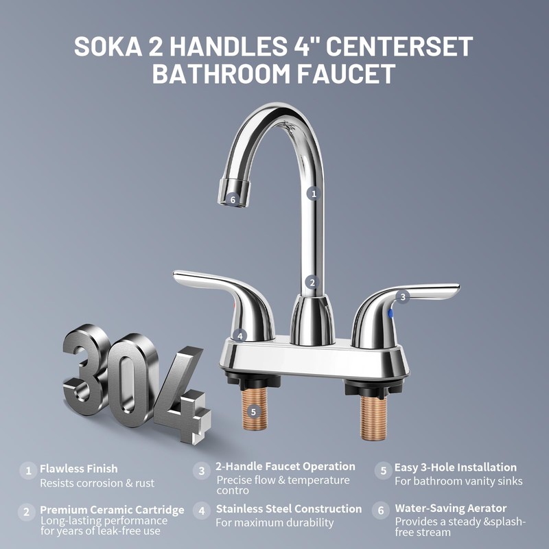 - Premium Material Construction: The SOKA centerset bathroom faucet is crafted from durable and reliable materials, featuring a ceramic disc cartridge, hybrid underbody, stainless steel spout and fauces body, and nylon braided water supply lines. This faucet conforms to low lead requirements for added safety and peace of mind.
