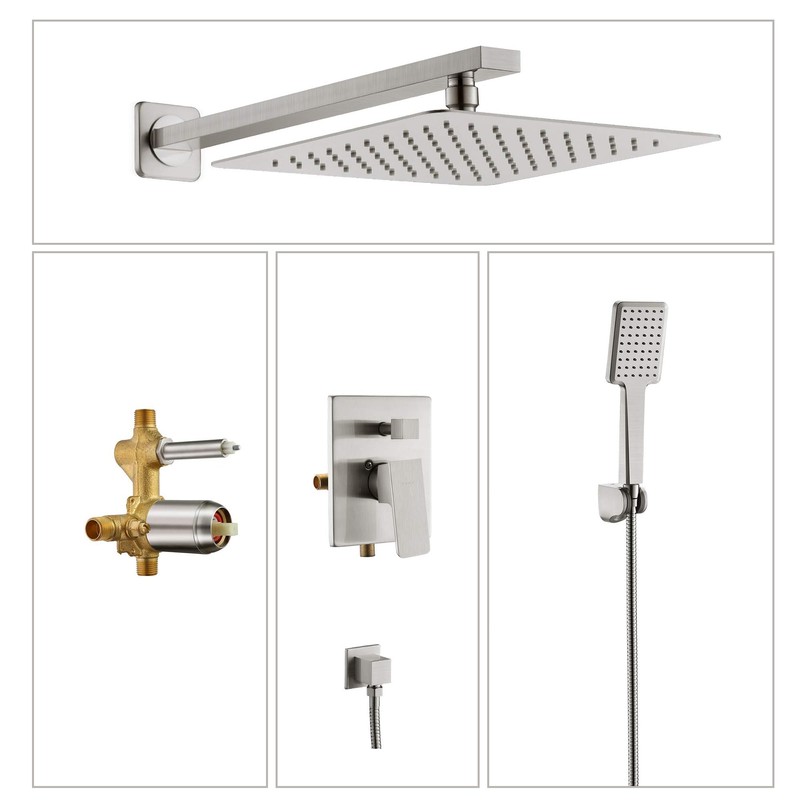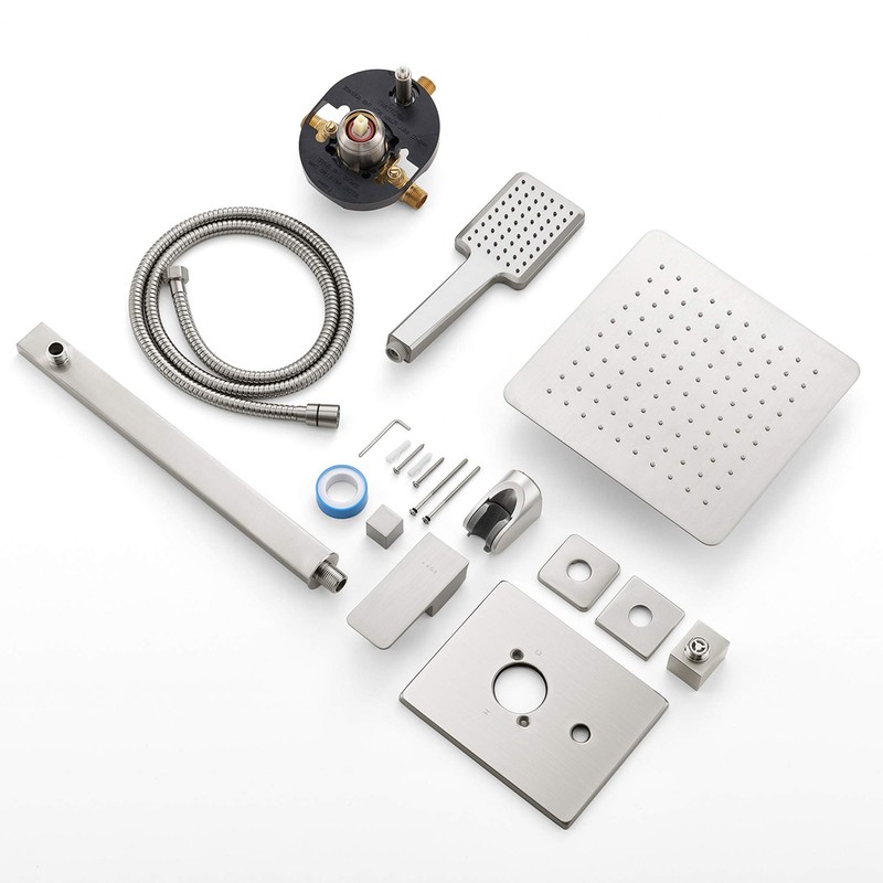 - Complete Package Contents: This shower faucet set includes everything you need: a 10-inch square rain shower head (304 stainless steel), handheld shower head (ABS), 15.3-inch shower arm (brass), 59-inch shower hose (304 stainless steel), shower holder (brass), and a brass shower mixer control valve.