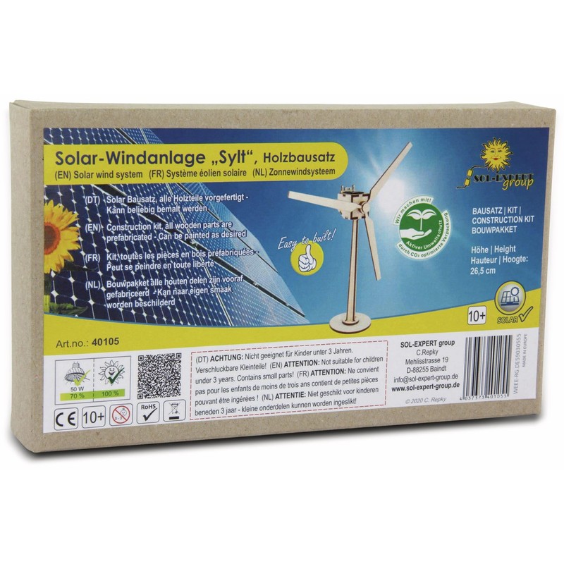 Dekorativer Holzbausatz einer drehenden Windanlage, angetrieben durch die Kraft des Sonnenlichts. Die Flügel der Solar-Windanlage „Sylt“ beginnen sich rasant zu drehen, sobald ausreichend Sonnenlicht auf das Solarmodul fällt. Ein toller Standort für dieses Modell ist daher eine Fensterbank im Süden, ein sonniger Balkon oder überall dort, wo direktes Sonnenlicht auf die Windanlage fallen kann. Das flotte Holzmodell wird aus nachhaltig angebautem Birkensperrholz gefertigt, hat ein Nabenhöhe von 16 cm, eine Flügellänge von 10 cm und erreicht somit beachtliche 26 cm Gesamthöhe. Der 14-teilige gelaserte Bausatz wird mit dem mitgeliefertem Holzkleber in nur ca. 10 Minuten aufgebaut und dank der detaillierten Anleitung, ist die Montage wirklich kinderleicht. Durch die kurze Bauzeit eignet sich das Modell hervorragend für ein Messeevent, einen Workshop oder z. B. für einen Bastelevent bei einem Kindergeburtstag. Verpackt ist der Bausatz in Papier und Karton. Auf Kunststoffe wurde bewusst zu Gunsten der Umwelt verzichtet.