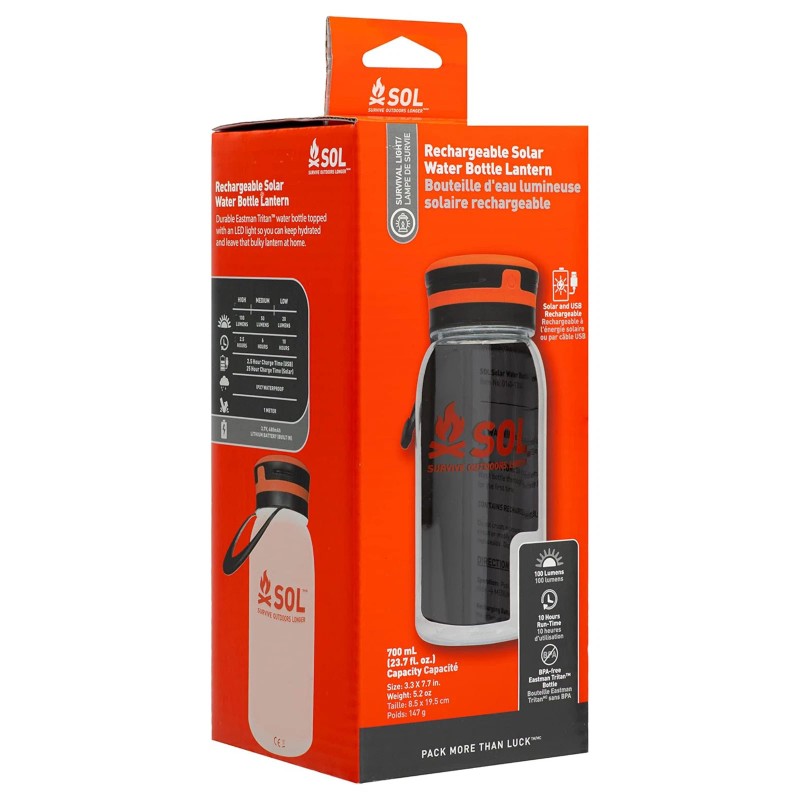 Light up the campsite picnic table or the trail ahead with the SOL Venture Solar Water Bottle Lantern. Rechargeable via USB or sunlight, the lid on the 700mL BPA-FREE Eastman Tritan water bottle has a lithium-ion battery and LED light. 3 lighting modes range from 20 to 100 lumens and up to 10 hours run time. Stay hydrated and pack sunlight wherever you go with the rechargeable Solar Water Bottle Lantern.