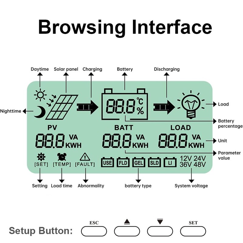 - CompatibilityThis solar controller automatically recognizes the V/V system voltages, and allows for battery modes to be freely set, including USE, FLD, GEL, SLD, and Li. Charging parameters can be set in USE and Li modes, including Floating Voltage (FLD), Low Voltage Disconnect Restoring Voltage (LRV), and Low Voltage Disconnect Voltage (LDV)