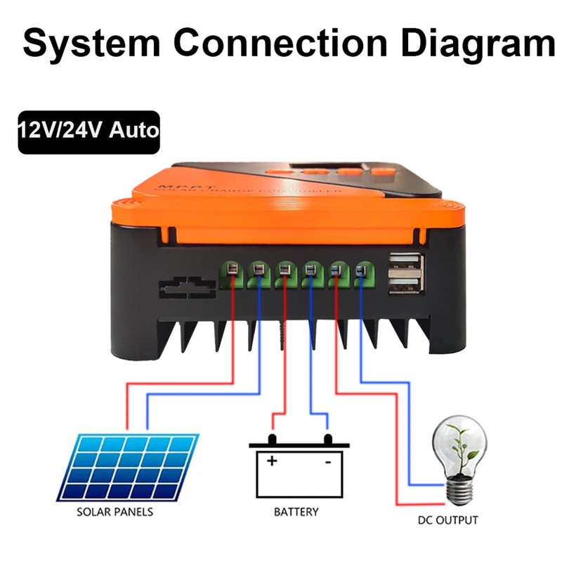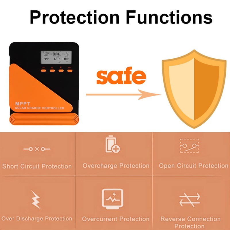 - ProtectionThe solar charge controller has Short Circuit Protection, Over Discharge Protection, Overcharge Protection, Overcurrent Protection, Open Circuit Protection, Reverse Connection Protection, Over temperature and TVS lightning protection intelligent protection function, which can help you to safely improve the efficiency of the system and extend the service life of the battery