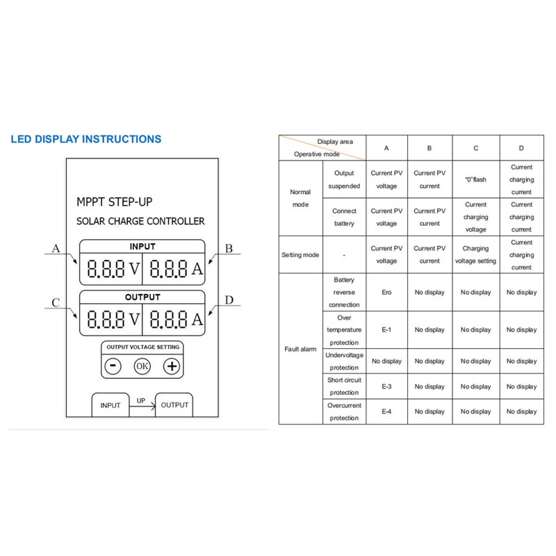 1、REAL TIME TRACKING FUNCTION: MPPT type is suitable for solar panels of different voltages, with high efficiency MPPT real time tracking 2、HIGH CONVERSION EFFICIENCY: High efficiency synchronous rectifier circuit structure is adopted, which has high conversion efficiency in low power charging environment 3、VOLTAGE ADJUSTABLE AND WATERPROOF: Output voltage is adjustable, support acid and lithium batteries, etc. Waterproof, dustproof, shockproof 4、MULTIPLE PROTECTIONS: Voltage and current LED display, efficiency is more than or equal to 95%, with short circuit protection, over temperature protection, and under voltage protection 5、WIDE RANGE OF USES: Suitable for solar street light controllers, solar chargers, solar electric bicycle, solar electric tricycles, solar toy cars, household solar panels, solar monitoring and other usage scenarios