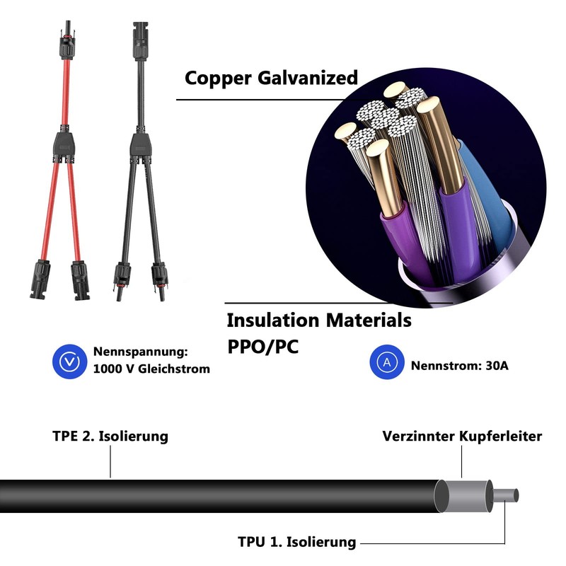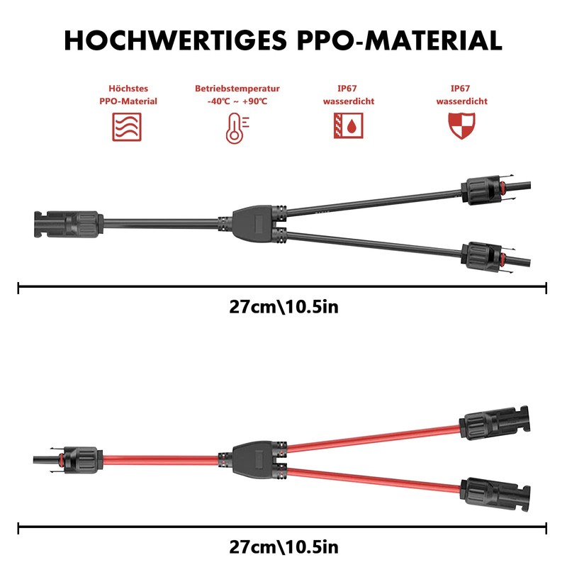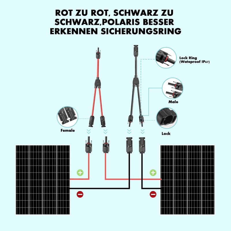 - Humanised design and easy to distinguish: This solar cable Y-splitter is designed to complete a solar panel (PV) array, typically in parallel applications. Red to red, black to black, polarity can be seen better.