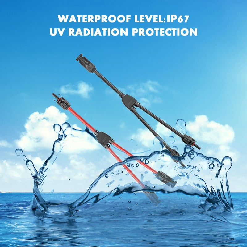 - UL certification Y-branch plug: this solar panel cable rated current: 30 A; rated voltage: TÜV 1000 V DC / UL 600 V DC. These connectors made of hard plastic IP67 are waterproof and resist dust deposits. Wide operating temperature range: -40°F to 185°F, fireproof and low contact resistance.
