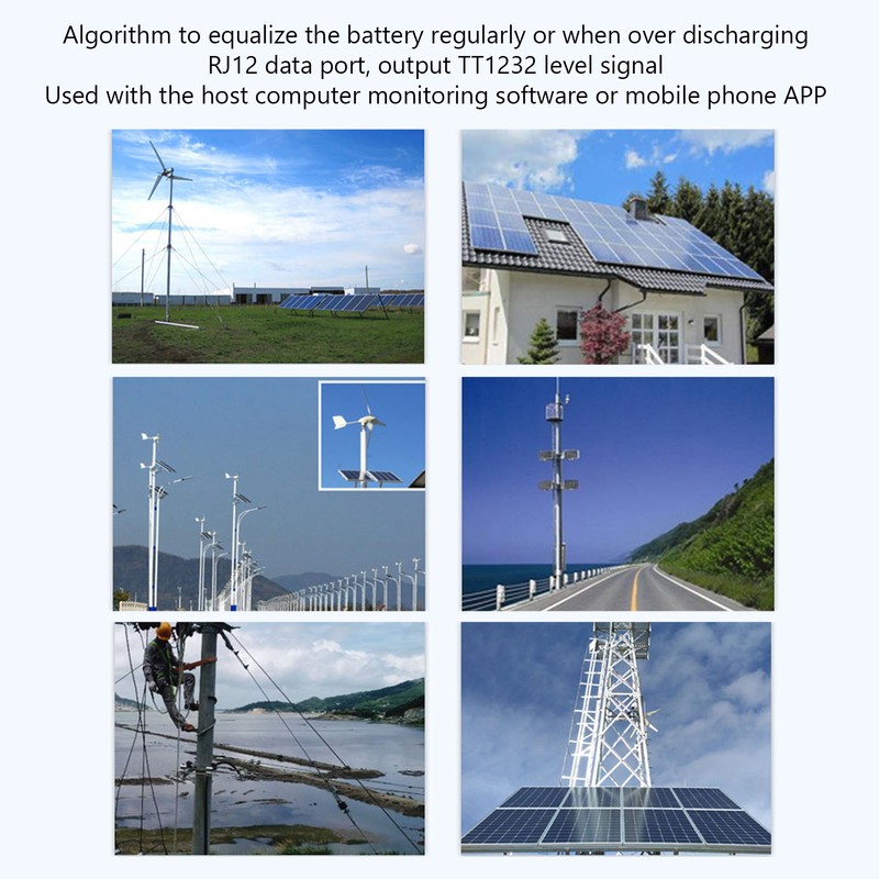 1、POWER OFF MEMORY: Automatic identification of 12V 24V system voltage, there are a series of parameter settings and power off save function, so that no need to repeat settings. Using temperature compensation, charging parameters can be automatically adjusted 2、LONG BATTERY LIFE: Using the upgraded 3 level P charging algorithm to equalize the battery regularly or when over discharging, can effectively prevent non equalization and vulcanization of battery, thus prolonging the service life of battery 3、SUPPORT LOAD START: A variety of load operation modes are available, which is convenient for the product to be applied to different types of loads. With the advanced load start method, large capacitive loads can be started smoothly. With industrial grade design, the product can work well under various harsh conditions run 4、MULTIPLE PROTECTIONS: Solar charge controller provides overcharge, overdischarge, overload protection, as well as short circuit protection, TVS thunder protection 5、SIMPLE OPERATION: The controller provides a dot matrix graphic LCD screen and a human machine interface with 2 buttons. The user friendly design of the browser and dynamic interface ensures the convenience and intuitiveness of operation 6、OPTIONAL COMMUNICATION FUNCTION: Providing an RJ12 data port, output TT1232 level or Bluetooth signal, the data adopts standard hobu protocol, can be used with the host computer monitoring software or mobile phone APP