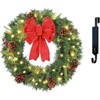 Solar Christmas Wreath Pre-Lit Solar 50 Led Artificial Wreath Outdoor Front Door Window Christmas Decorations with Frosted Branches Pine Cones Berry Clusters Red Velvet Bows 24 Inches