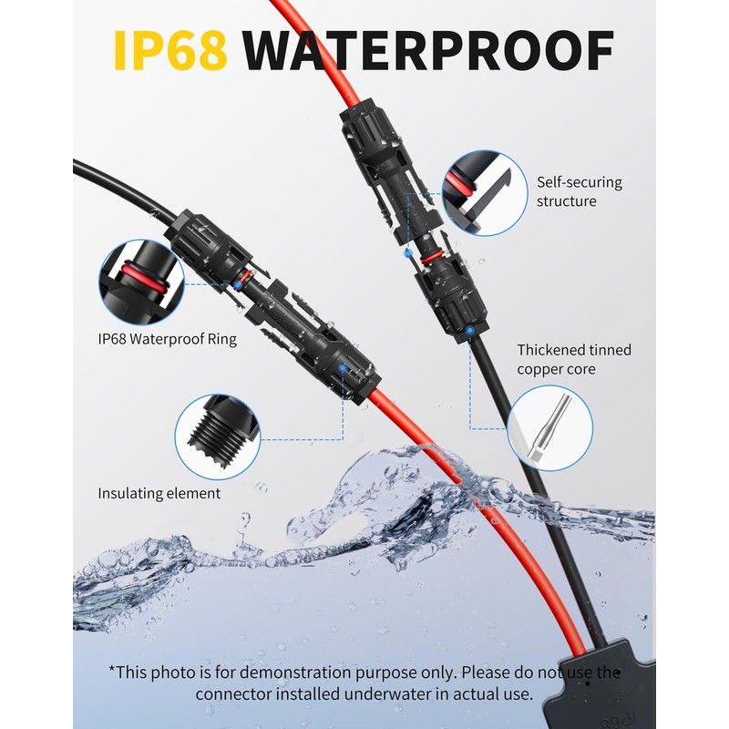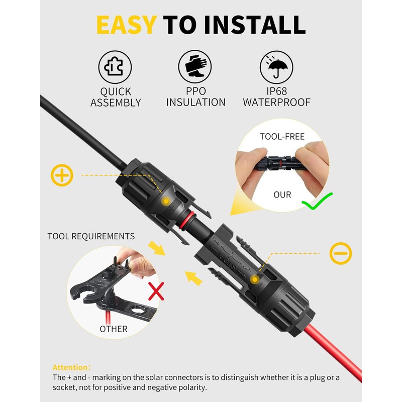 - 【Plug and Play】 The self-locking system of the solar panel parallel connectors makes them easy to insert and remove. No extra tools are needed for quick assembly, ensuring a secure and stable connection between the solar cable and the solar panels, enhancing system safety and efficiency.