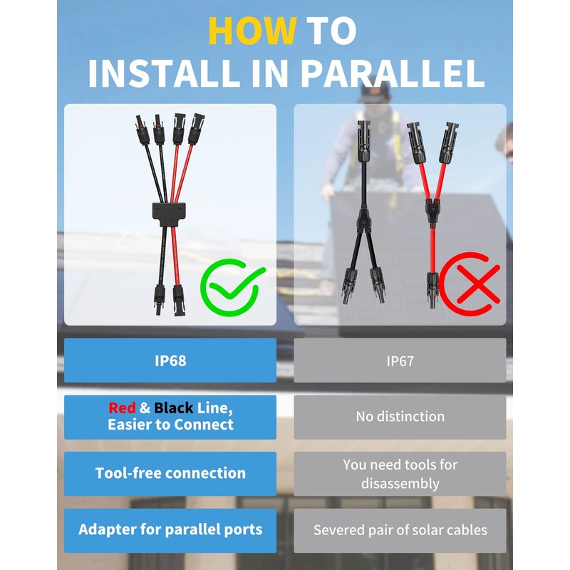 - 【IP68 Waterproof】 The ENERNOVA Y-Branch Cable featuring an IP68-rated connector with dustproof and waterproof seals. With a 30A current rating and DC 1500V voltage rating, it operates efficiently in temperatures ranging from -40°C to 90°C, allowing for outdoor use in extreme weather.