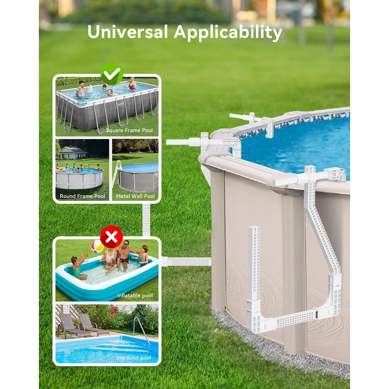 - 【Quick and Easy Installation】 : No need for any tools and no drilling required. Simply assemble the hook, place it on the top edge of your pool, and tighten the knob to secure its position.