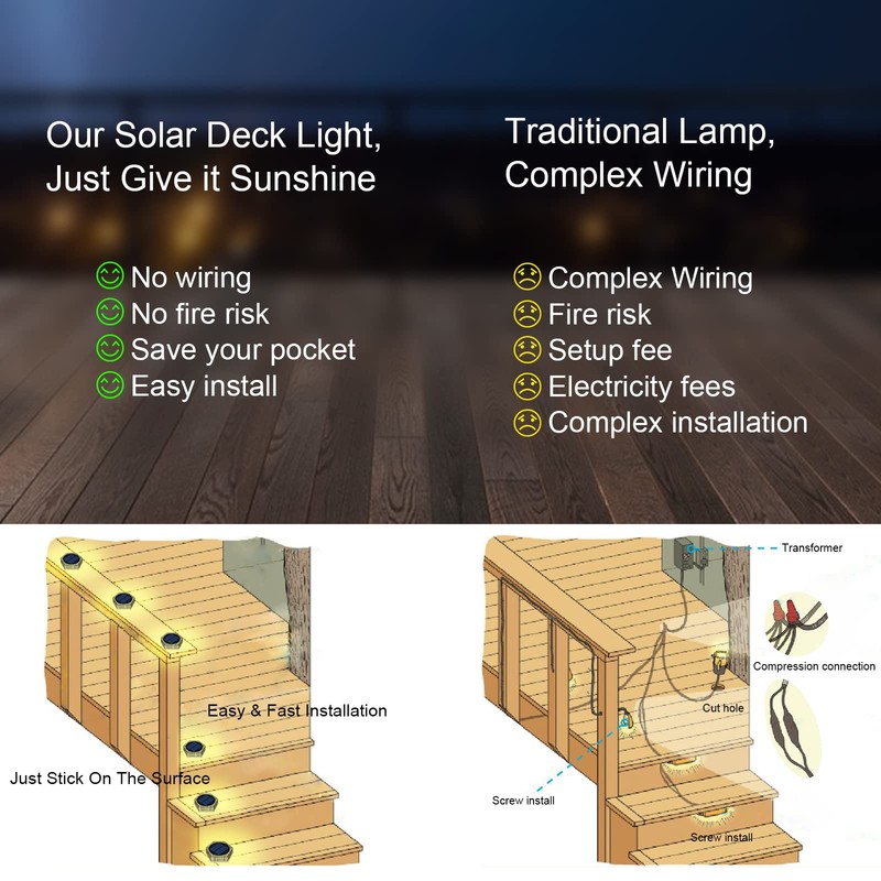 - 【Easy Installation】 No wiring, No drilling, No Screws, these solar fence lights with strong NANO double-sided tape, simple and firmly, also you can use as stick on solar post lights for your railing.