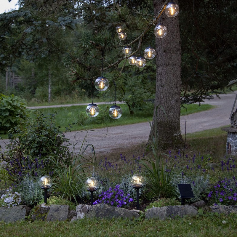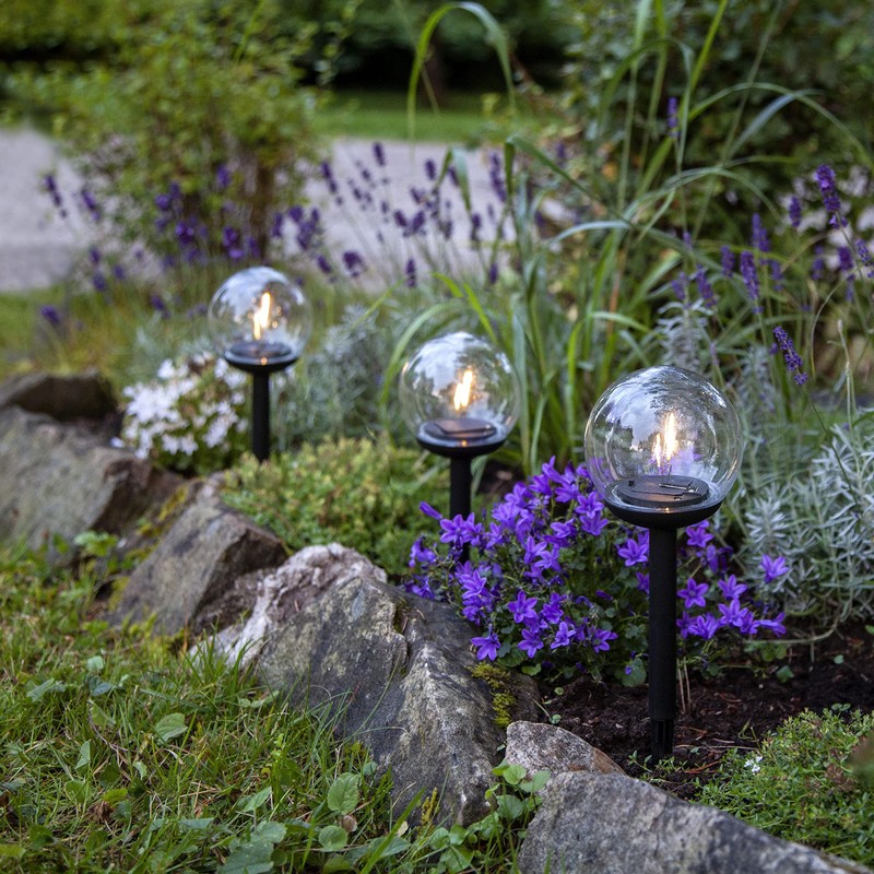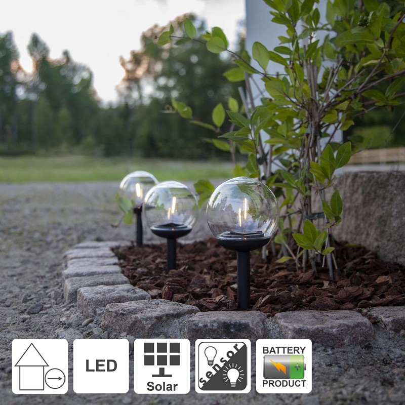 • The LED solar path light set consists of three bollard lights with black ground spikes, each with a clear ball with a diameter of 10 cm. Transparent plastic balls make the filaments visible inside