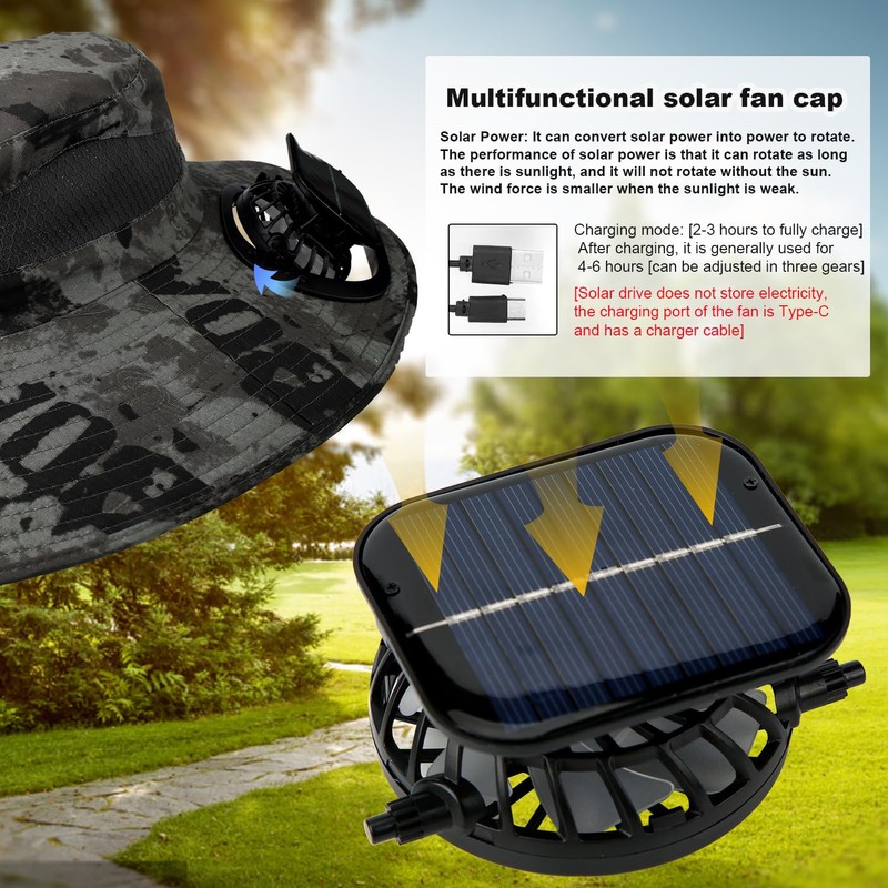 - 2 Power Methods: The outdoor sun hat features 2 power methods for charging, including solar power supply, which allows you to harness power from the sun, and USB charging, providing you with the flexibility to power up the fans wherever you are.
