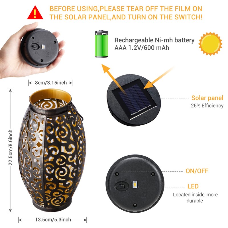 - WATERPROOF & RUSTPROOF: Crafted from high-quality plastic and premium metal, these solar lights are waterproof (IP44), heatproof, and prepared for whatever weather comes their way. Better yet, the switch is designed in the inside of the lamp for extra waterproof effect. (Note: Do not immerse the light into water.)