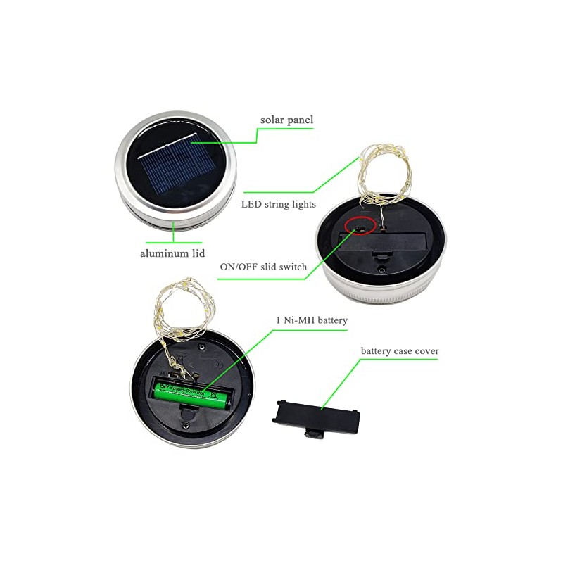 **Specifications** ♥ * ➤The Solar Mason Jar Lid Lights with 20 ultra bright LEDs Powered by solar and working with AAA rechargeable battery.The insert is perfect for DIY, solar walkway lighting, garden/patio/lawn pendant light, solar garden lighting, and creating a perfect summer ambiance for your garden. ➤Pack of 10, 20 Led String Fairy Star Firefly Jar Lids Lights,10 Hangers included(Jars Not Included).Put the solar panels with string lights into the jar lids ring. 2 3⁄8 in (60 mm) inner and 2 3⁄4 in (70 mm) outer diameter.Fits for most Regular Mouth mason jar. Like all Major Brands: Ball,Kerr,Golden Harvest,Kilner and Generic Mason Jars. **♥Specification:** Brand: SmilingTown Light Color: Warm White Mode: Steady (No Flicker) Led Quantity of each Light: 20 Power Source: Solar Charging/ AAA Battery Lid Diameter Size: Lid 2.76""(70mm)/Insert 2.36""(60mm) **♥Notice:** * If you receive the lid lights and find it is not bright, please put the lids under the sun for charging at first. * Please Noticed Each light includes an On/Off switch underneath the lid, Keep it ON before charging by solar. * If there is long time without sunlight, The lights can also working by AAA Battery only. **♥Package includes:** 10 x Solar mason jar lid lights 10 x Stainless Steel Wire Hangers (AAA Rechargeable Battery Included) (Manson Jars are Not Included)