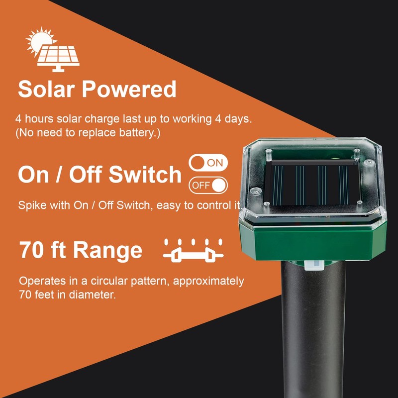 - 【SOLAR POWER】☀️ This mole repellent features a built-in rechargeable battery. Charge it for just 4 hours, and it works for up to 4 days! 🔋 No need to replace batteries—save both energy and electricity while protecting your outdoor space. 🌿💡