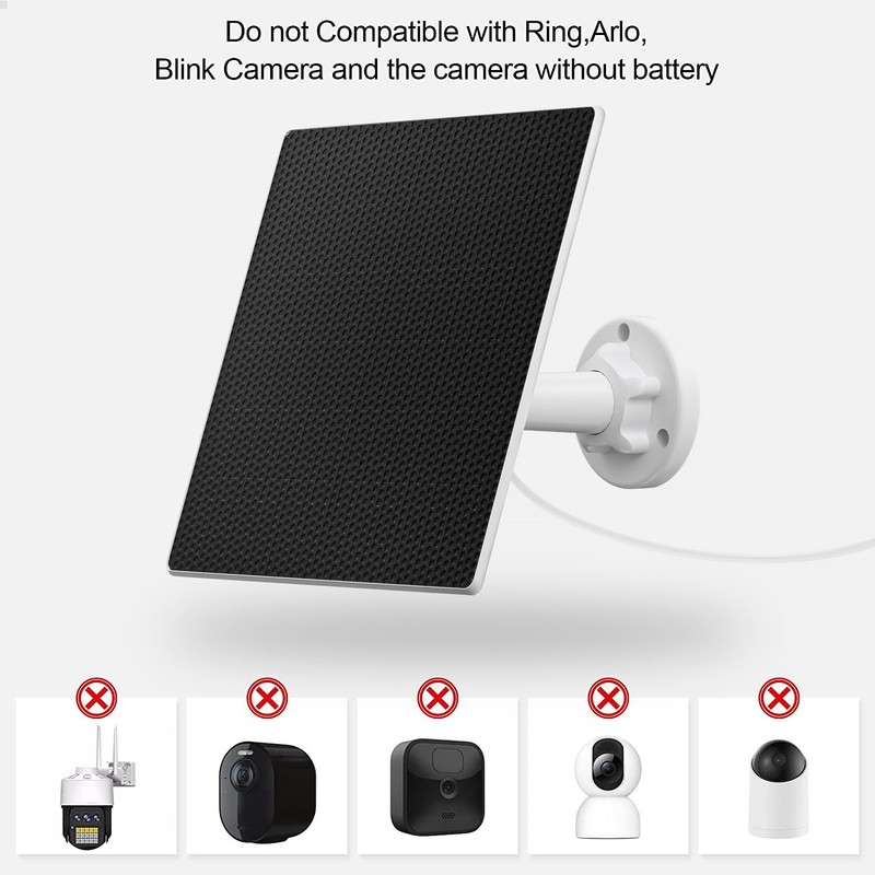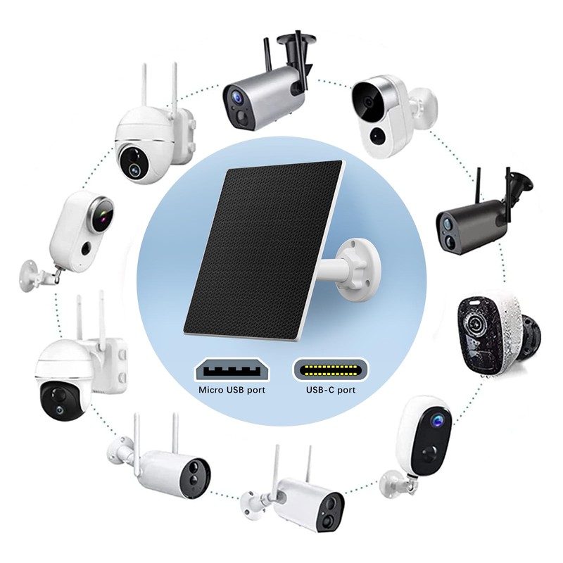 - Compatible with Micro USB & USB -C Port Camera:The 5 watt solar panel compatible with Micro USB & USB -C Port Camera,do not compatible with Ring,Arlo Blink Camera.