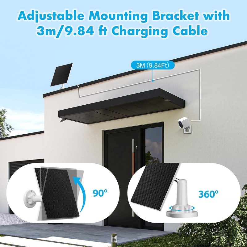 - Resist All Weather:The solar panel camera is IP65 waterproof and can resist all weather including rain, snow, thunderstorm.This solar panel for battery camera with 9.84 ft power cord,360-degree swivel and 90-degree adjustable wall mount,it allows you to choose the best position for your panel to receive direct sunlight.