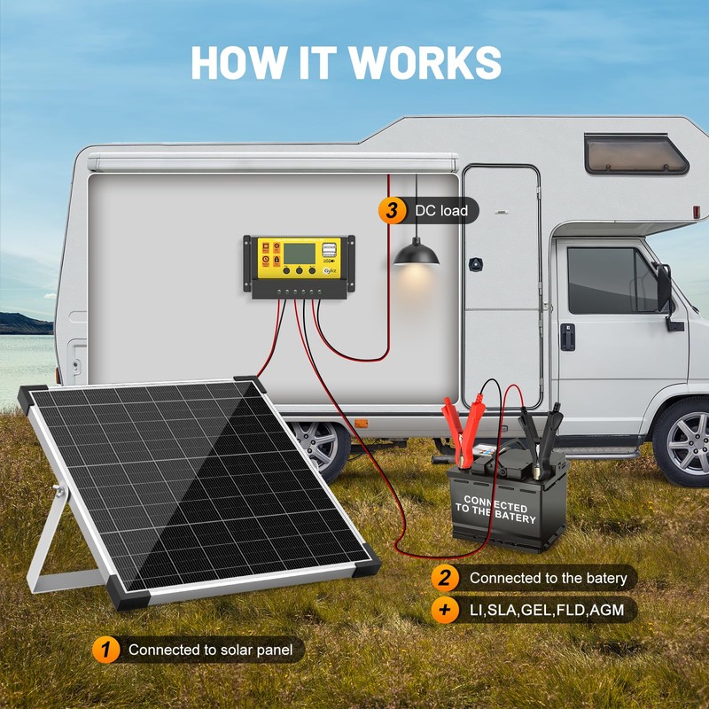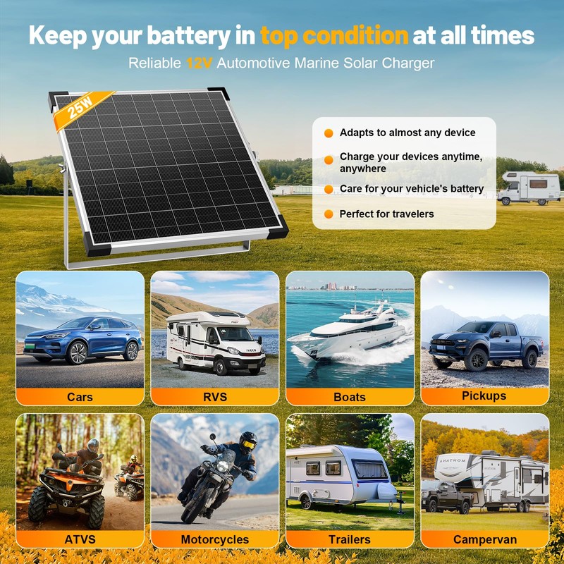 - 【Multiple Compatibility】This is a perfect 25W solar battery maintainer solar panel kit, compatible with 12V rechargeable batteries, including RVs, trucks, cars, rooftops, camping, cabins, yachts, boats, lawn mowers, electric fences electric bikes, pickup trucks, golf carts, snowmobiles, lawn mowers, electric fences, water pumps, gate openers and more.