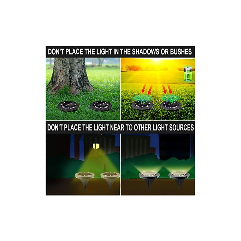 - ♻【Easy to Install】outdoor solar disk lights are ideal for hassle free illumination and outdoor temporary yard lighting,no tool and wiring are required,just peel off the plastic film and turn on the switch on the back, you can put the outdoor garden solar lights on the flat deck or install solar disc lights with stakes in a flowerbed where you frequently dig without worrying about damaging electrical wires and worrying about your dog chewing through or tripping on electrical wires.
