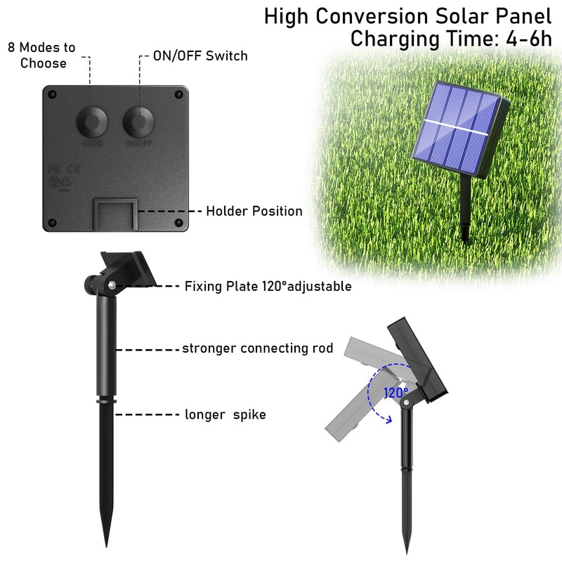 **Solar string lights are work at night automatically after charged enough sunlight in daytime!** Product is waterproof,In order to maintain a long using life that is need to avoid the violent storm/water to attack the solar panel. **Specification:** <1\. Light color: Cool White 2\. Solar panel 2V 400MA 3\. Battery: built-in 800MA AA NI-MH battery (It can be replaced by rechargeable battery) 4\. Cable length: Total length 12M/39.37ft, lead length: 2M/6.56ft, lamp spacing: 0.1M/0.33ft 5\. Charging time: 5-8hours 6\. Working time: 8-12hours 7\. Switch: Power ON/OFF& MODE 8\. LED quantity: 100pcs, 100 LED at 10cm spacing 9\. Light modes: 8 modes **Package Included:** 1x Solar Panel with stand 1x 100 LED Solar Rope String Fairy Christmas Lights 1 x Product specification twinkle/flash, and steady on. Powered by solar no plug in. The solar panel is under IP44 waterproof Rating.