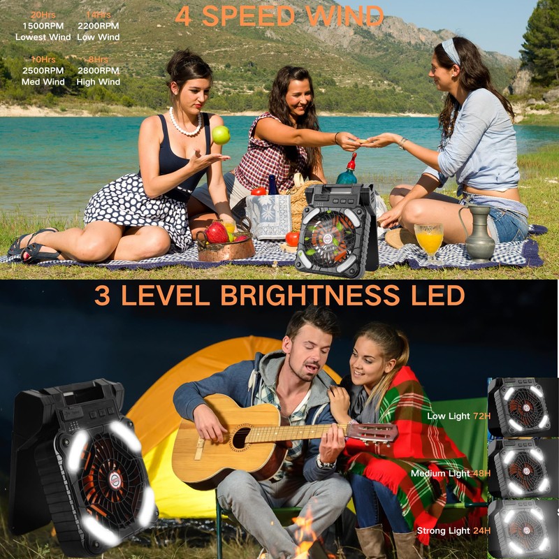 Solar Powered Portable Camping Fan,10400mAh rechargeable Solar Power Cordless Battery Fan with LED Lantern | 4 Wind Speeds Adjustable |3 Timers Modes | Quiet , Perfect for Tent, Fishing ,Picnic,orange