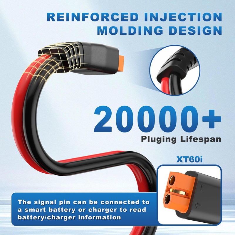 - 【Upgraded 20000+ Bend XT60/XT60i Connector】---The XT60/XT60i has a new upgrated and reinforced injection molding design, and has passed a 20000+ bend and plug test lifespan , strengthens the fixing and safety of the solar wire, which prolongs the solar xt60/xt60i female cable's service life.
