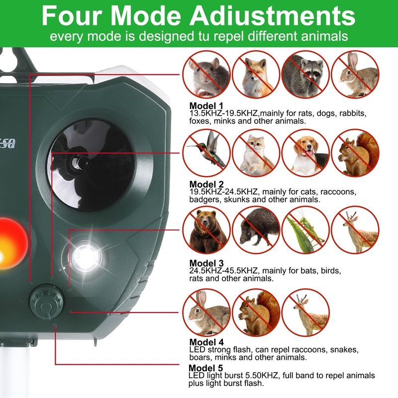 - Upgraded Ultrasonic Animal Repeller: Adopts advanced ultrasonic and PIR motion activated technology, and equipped with strong LED flashing light. It can effectively repel animals and pests by emitting powerful ultrasonic wave and strong LED flashing light, and the irregular and variable frequency makes it more effective to drive away the most aggressive animals which may adapt and become immune to a certain frequency band.