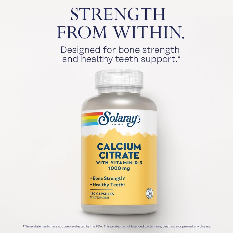 Solaray Calcium Citrate with Vitamin D3 1000mg - Bone Strength and Healthy Teeth Support - Gentle Digestion Formula - Lab Verified, 60-Day Guarantee - 30 Servings, 180 Capsules