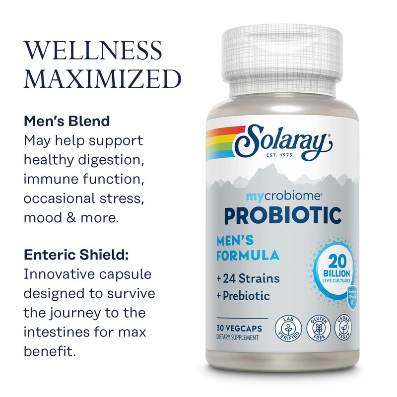 SOLARAY SOLARAY Mycrobiome Probiotic Men's Formula, Probiotics for Men, Gut Health, Digestion, Immune Function & More, 20 Billion CFU Mens Probiotic, 24 Strains Plus Prebiotic, 30 Servings, 30 VegCaps