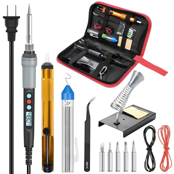 Solder Iron Kit,HANDSKIT Soldeirng Iron Kit Temperature Adjustable Electronic Welding Tools Desoldering Pump,Soldering Tips,Solder Iron Stand,Tweezers,Tin Wire for Repairing,DIY or Lab Testing