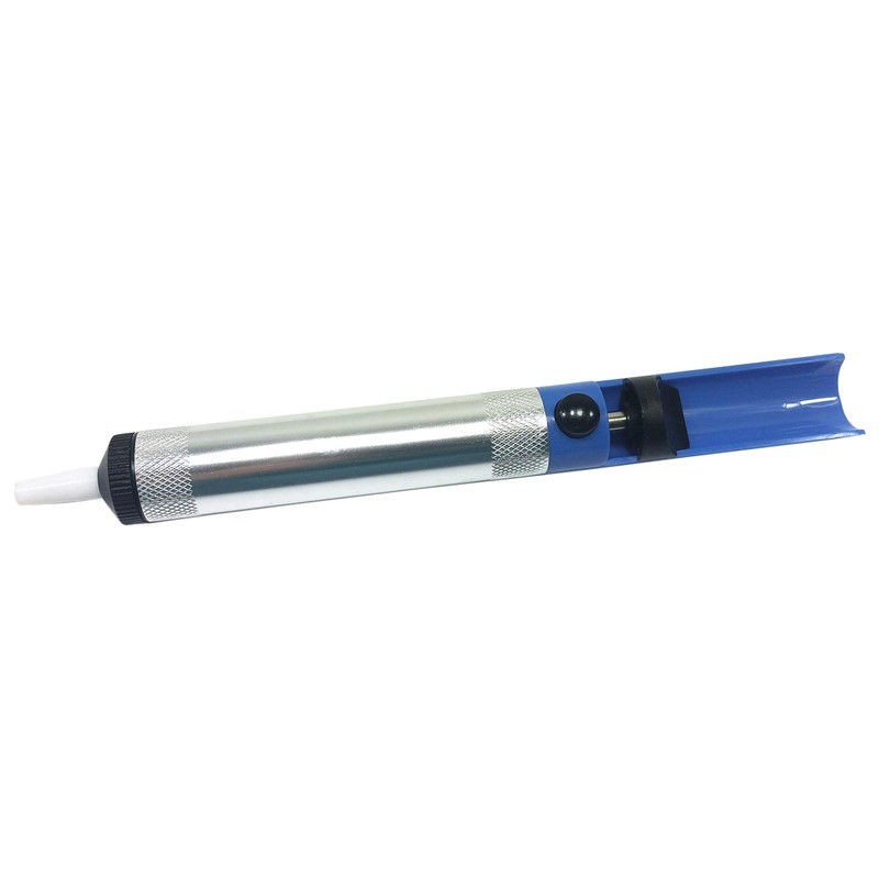 - Fast action desoldering pump — simply heat up solder joint and push button