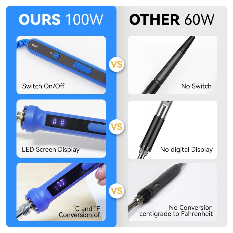 - Latest premium soldering iron: this 100 W soldering iron with ceramic technology, the soldering gun allows faster heating and energy saving of the soldering iron. The four ventilation holes on the soldering iron gun ensure better heat dissipation, safer soldering; new on/off switches on the soldering gun allow convenient operation, equipped with a large LCD display. The digital soldering iron is equipped with an ergonomic non-slip handle that provides a comfortable grip.