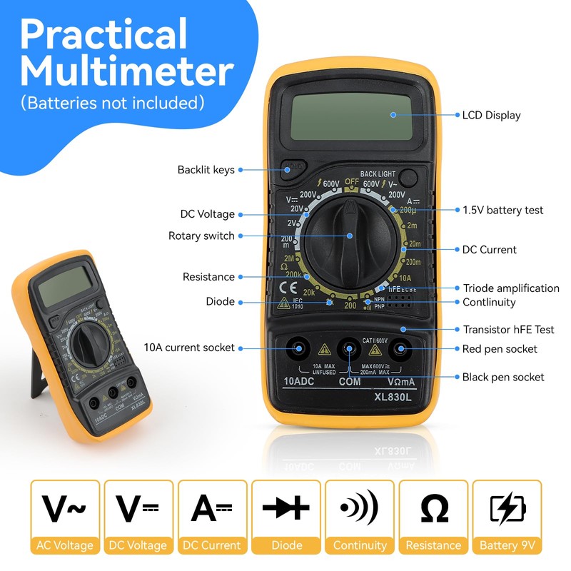- Multifunctional digital multimeter: multifunctional digital multimeter with a large LCD display and backlight, you can easily read the data in multiple environments (battery not included), practical for measuring DC and AC voltage, DC and AC current, resistance, diode, transistor hFE, continuity test.