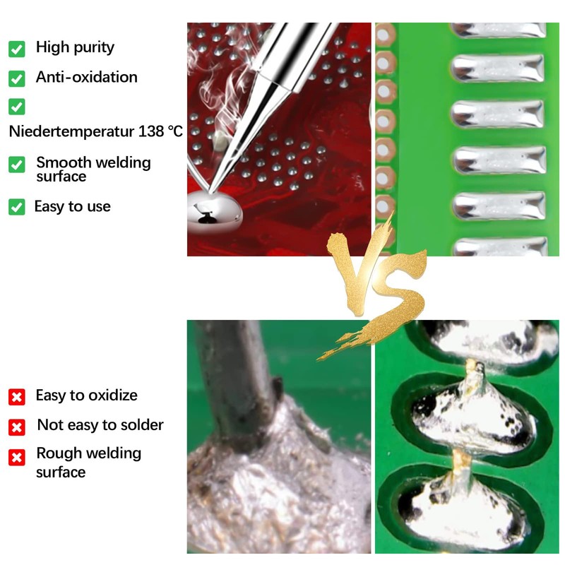 - Soldering silver solder with lead tin - XW5 low temperature solder wire (0.5mm) with 138°C melting point: ideal for sensitive electronics such as iPhone motherboards! The alloy (Sn42%/Bi50%/Cu8%) ensures fast, gentle soldering without overheating micro components.