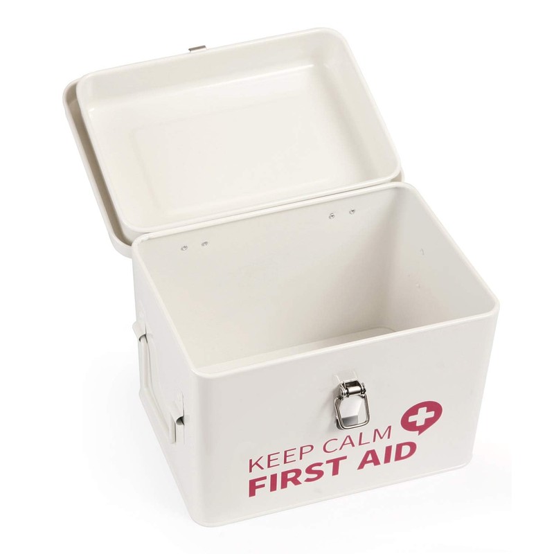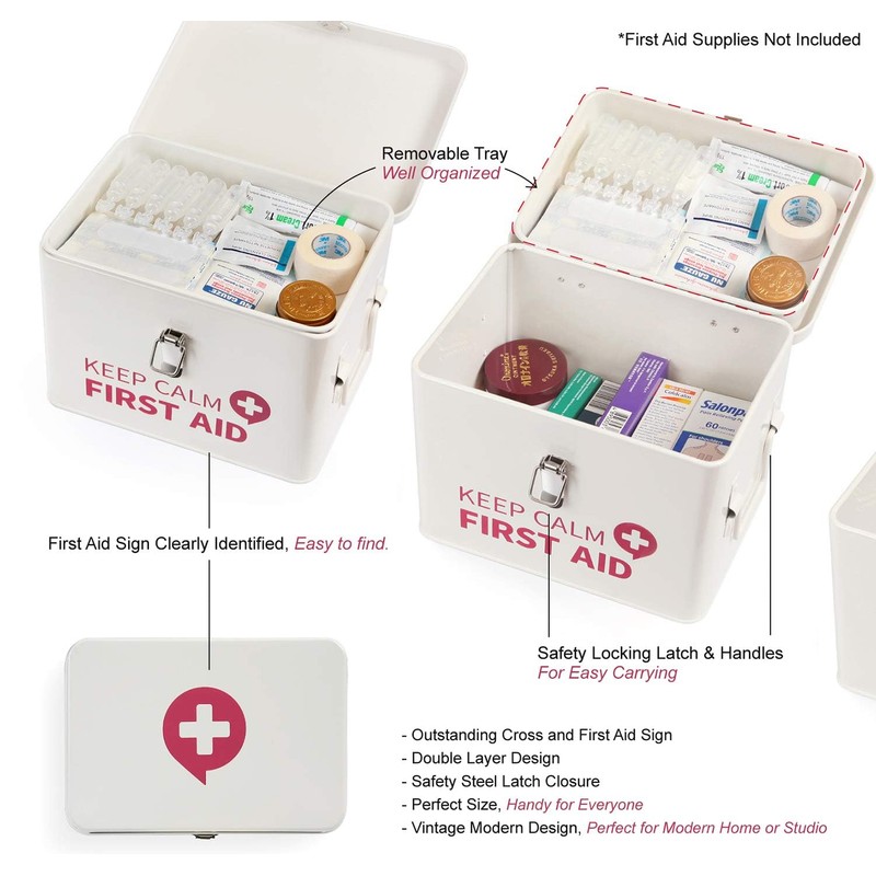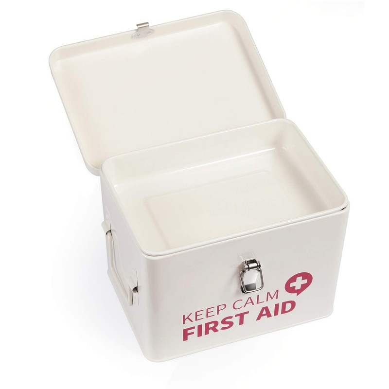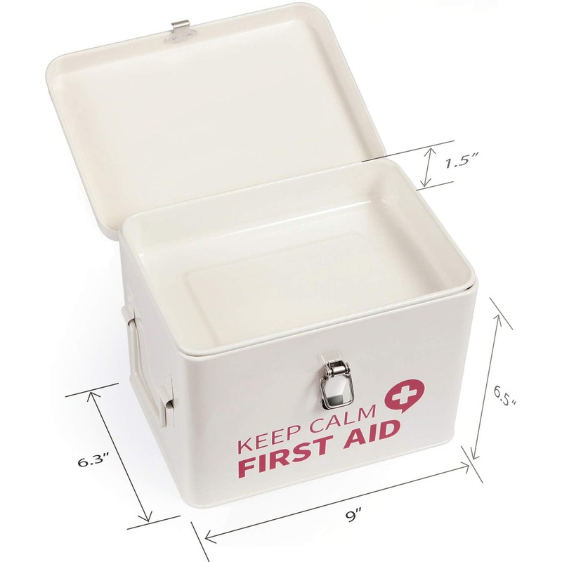 SoldSimple Keep Calm First Aid Medicine Organizer Storage Metal box with Lid, Latch Closure, Removable Tray and side handles, Vintage Empty Box for Home, 9" x 6.3" x 6.5", Milky White