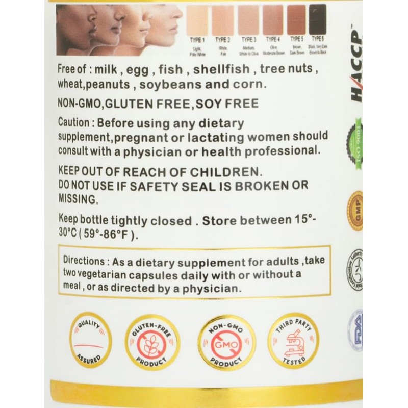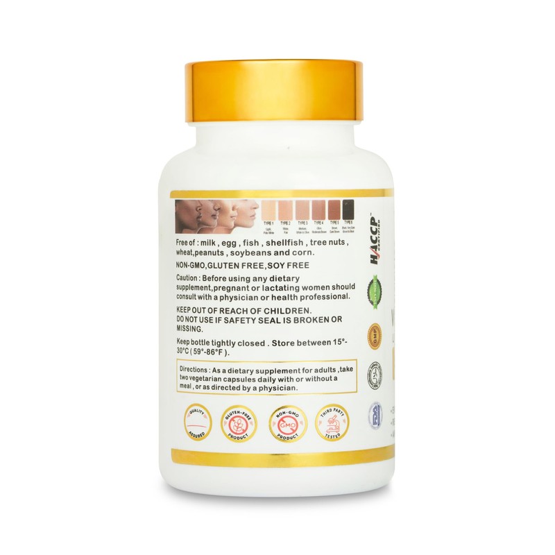 Product description- Achieve radiant, luminous skin - Glutathione pills for beauty enhancement - Nourishes skin and lightens tone gently - Promotes a smooth, glowing complexion - Safe for all body parts, including private and sensitive areas - Targets dark spots, acne scars, and hyperpigmentation - Natural supplement fights oxidative stress - Neutralizes free radicals for better health - Anti-aging benefits: reduces free radicals, boosts immunity, detoxifies liver - May inhibit melanin production for skin whitening and age spot reductionIngredientsLiposome GlutathioneVitamin CMarine CollagenCo enzyme Q10Hypromellose (Cellulose Capsule) and Magnesium Stearate (Vegetable Source)Safety WarningBefore using any dietary supplement, pregnant or lactating women should consult with a physician or health professional.