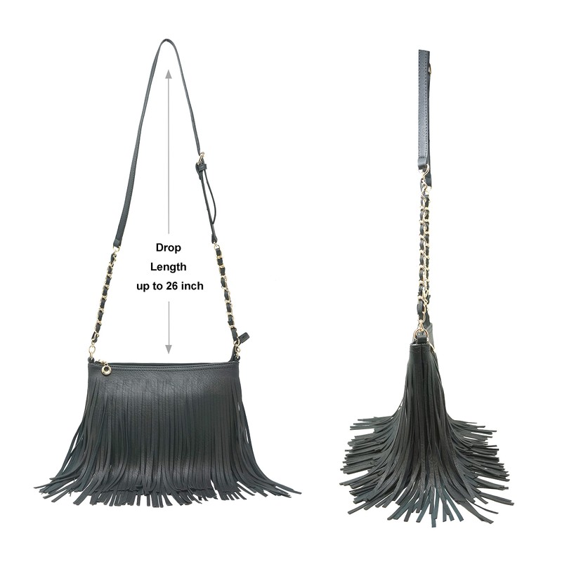 - This stylish fringe shoulder bag has an attached adjustable shoulder strap drop up to 26" and high quality gold tone hardware. Product actual usable size is 10" x 7" x 1". When cleaning the bag, it is recommended to moisten a soft non-abrasive cloth with warm water and wipe over.