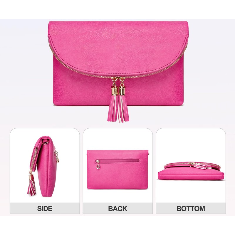Solene Womens Envelop Clutch Purse Multi Compartments, 6 Card Slot Inside, Crossbody Bag With Tassels (WU075 - Fuchsia)