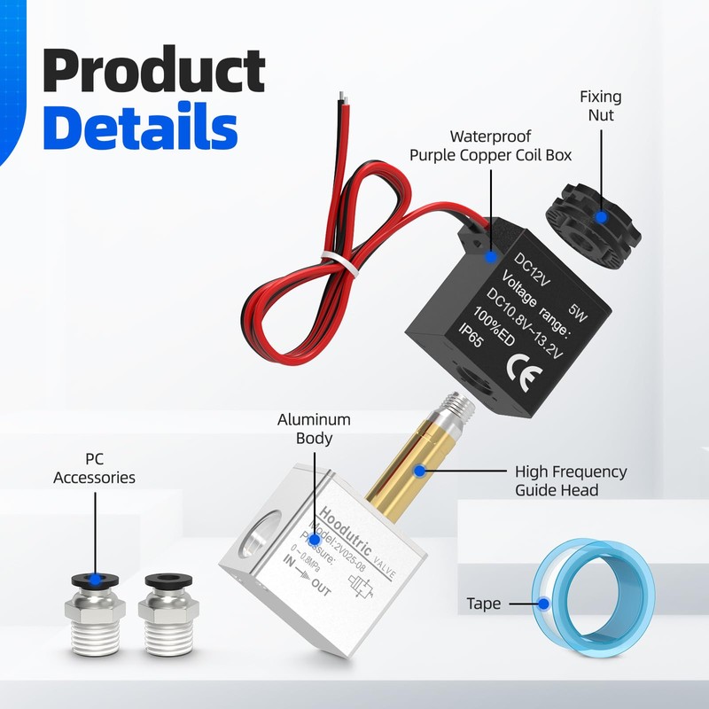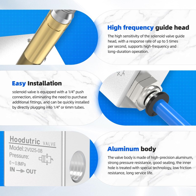- Easy Installation: Each solenoid valve is equipped with a 1/4" push connection, eliminating the need to purchase additional fittings, and can be quickly installed by directly plugging into 1/4" or 6mm tubes