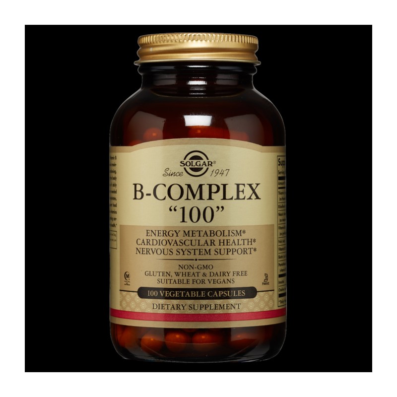 SOLGAR B-COMPLEX 100. FOR ENERGY METABOLISM, CARDIOVASCULAR& NERVOUS SYSTEM SUPPORT 100CAPSULES