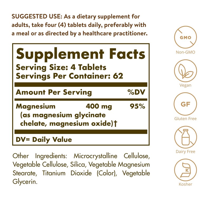 - Gluten, Wheat & Dairy Free; Solgar Chelated Magnesium is non-GMO, vegan and free of: gluten, wheat, dairy, soy, yeast, sugar, sodium, artificial flavor, sweetener, and color