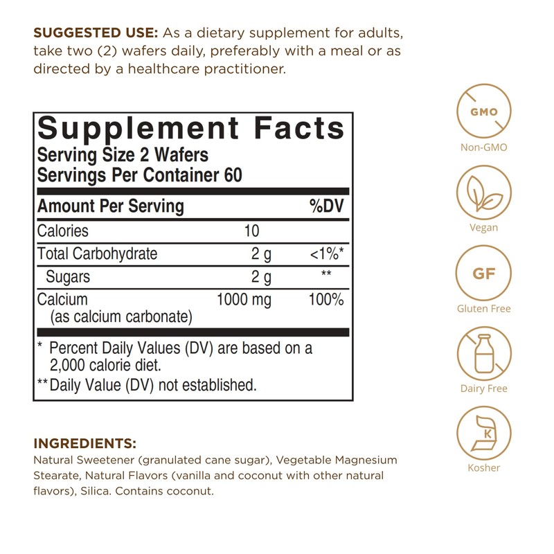 - Gluten, Wheat & Dairy Free; Solgar Chewable Calcium is non-GMO, vegan, kosher, and free of: gluten, wheat, dairy, soy, yeast, sodium, artificial flavor, artificial sweetener, preservatives, and color.