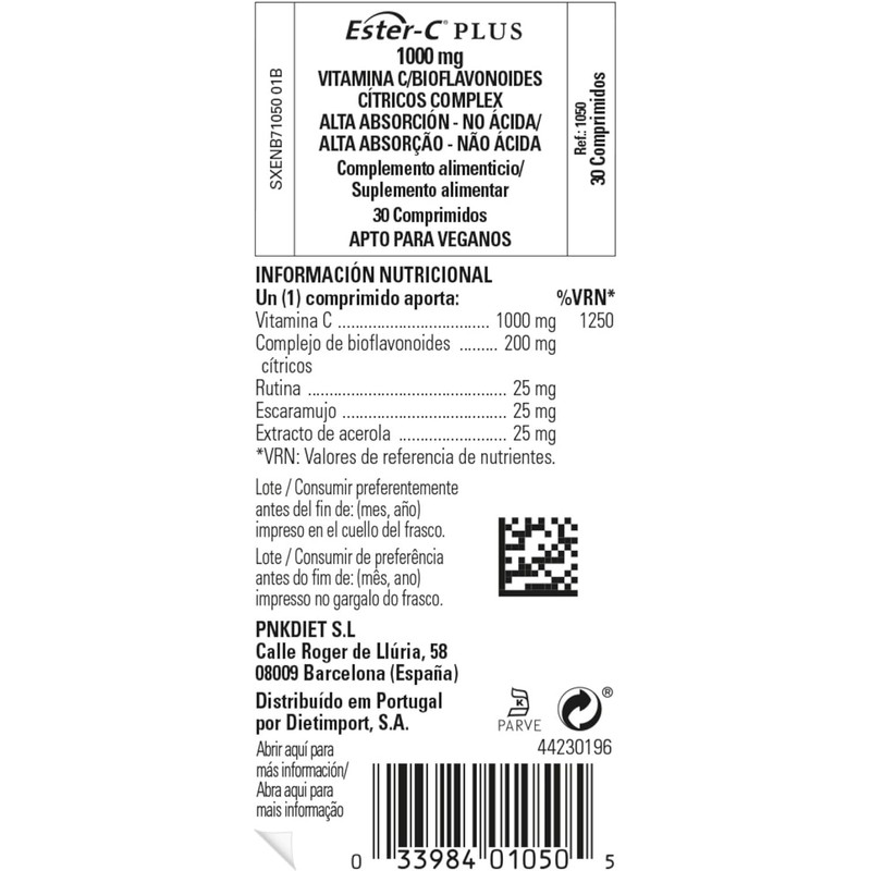 Vitamin C (as Ester-C, calcium L-Ascorbate) 1000 mg 1250, Citrus Bioflavonoid Complex 200 mg, Bulking Agents: microcrystalline cellulose, dicalcium phosphate, hydroxypropyl cellulose, Anti-Caking Agents: silicon dioxide, vegetable stearic acid, vegetable magnesium stearate, Rutin 25 mg, Cross-Linked Cellulose Gum, Rose Hips 25 mg, Powder Acerola 25 mg, Fruit Powdered Extract 4:1, Glazing Agents: hydroxypropylmethyl cellulose, vegetable glycerin (from palm kernel oil and coconut oil).